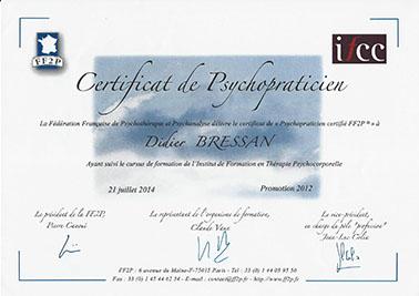 Je suis Didier BRESSAN, Psychopraticien Certifié® par la Fédération Française de Psychothérapie et Psychanalyse (FF2P), titulaire du Certificat Européen de Psychothérapie (CEP).